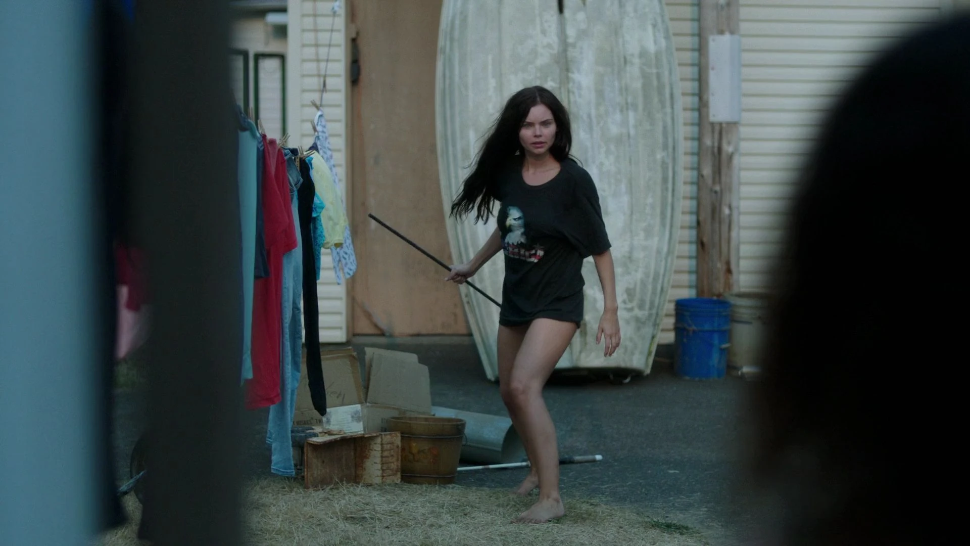 Meanwhile, back on land, a naked Ryn walks idly through a trailer park, sending a mother and her children inside. She spots some clothing on a drying rack and is intrigued by a shirt with an eagle on it. As she put it on, Vicki, the owner, catches Ryn and mistaking her for another junkie, angrily snaps at her. Ryn, spotting a pole behind her feet, hurls it through on the rainfall vents. She scares the owner and runs off. Ryn then breaks into Ben’s house, where a small aquarium catches her attention. As does a photo of Maddie and Ben.