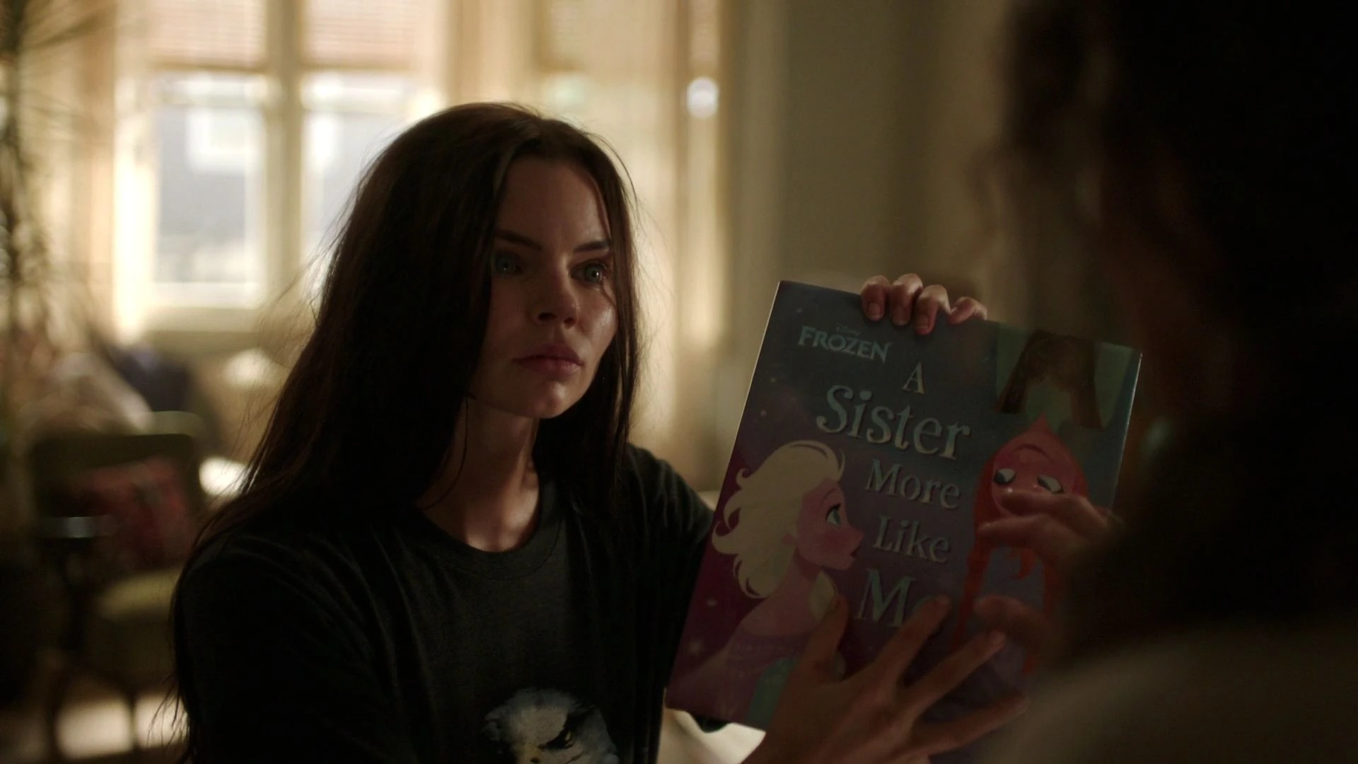 Ryn, having been taken in by Helen, picks up a Frozen book but her attention quickly switches to the TV. Helen appears, and a surprised Ryn spins and, using only one hand, roughly grabs Helen's neck. Helen pleads it's her, and Ryn, in a sign of recognization, releases her with an apologetic "Hello, Helen". Ryn picks up the Frozen book again and points at the "Sister" part of the title. Helen concludes that Ryn is looking for her sister. She hands her some clothing, which Ryn roughly takes and dresses. On the prowl once more, Ryn desperately looks for food. Just as she is about to break a jar of olives, Helen stops her and makes Ryn give it back. Helen tells her she knows what she needs, and pleads for her to stay. Helen then locks the shop up before heading out.